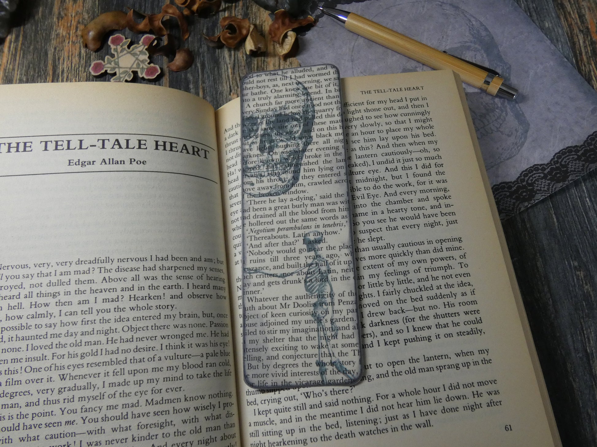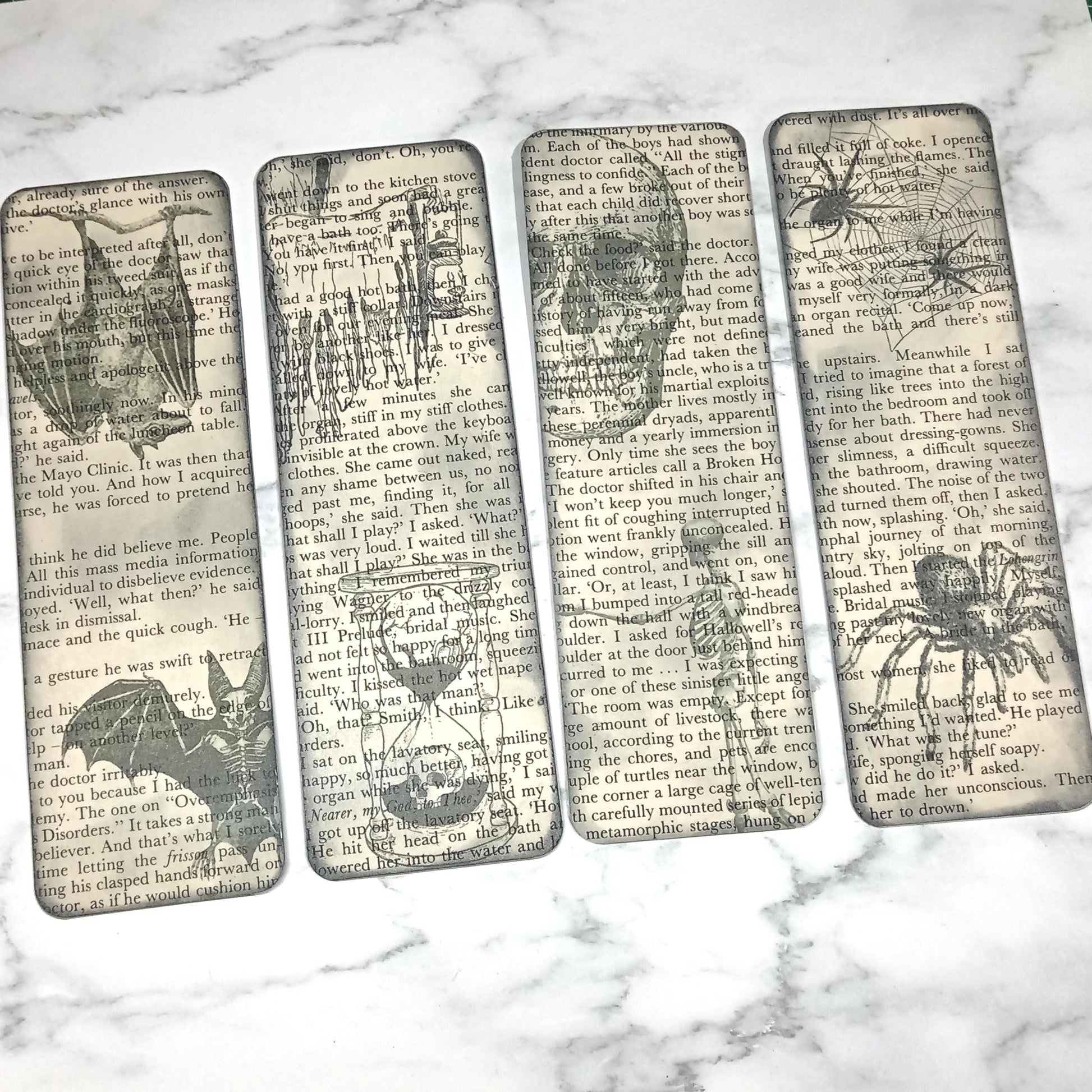 Make a mark with one of my gorgeous gothic bookmarks - 4 designs to choose from, skulls, reaper, bats or spiders, made from real book pages from a book of horror stories, with stamped images on the rear.