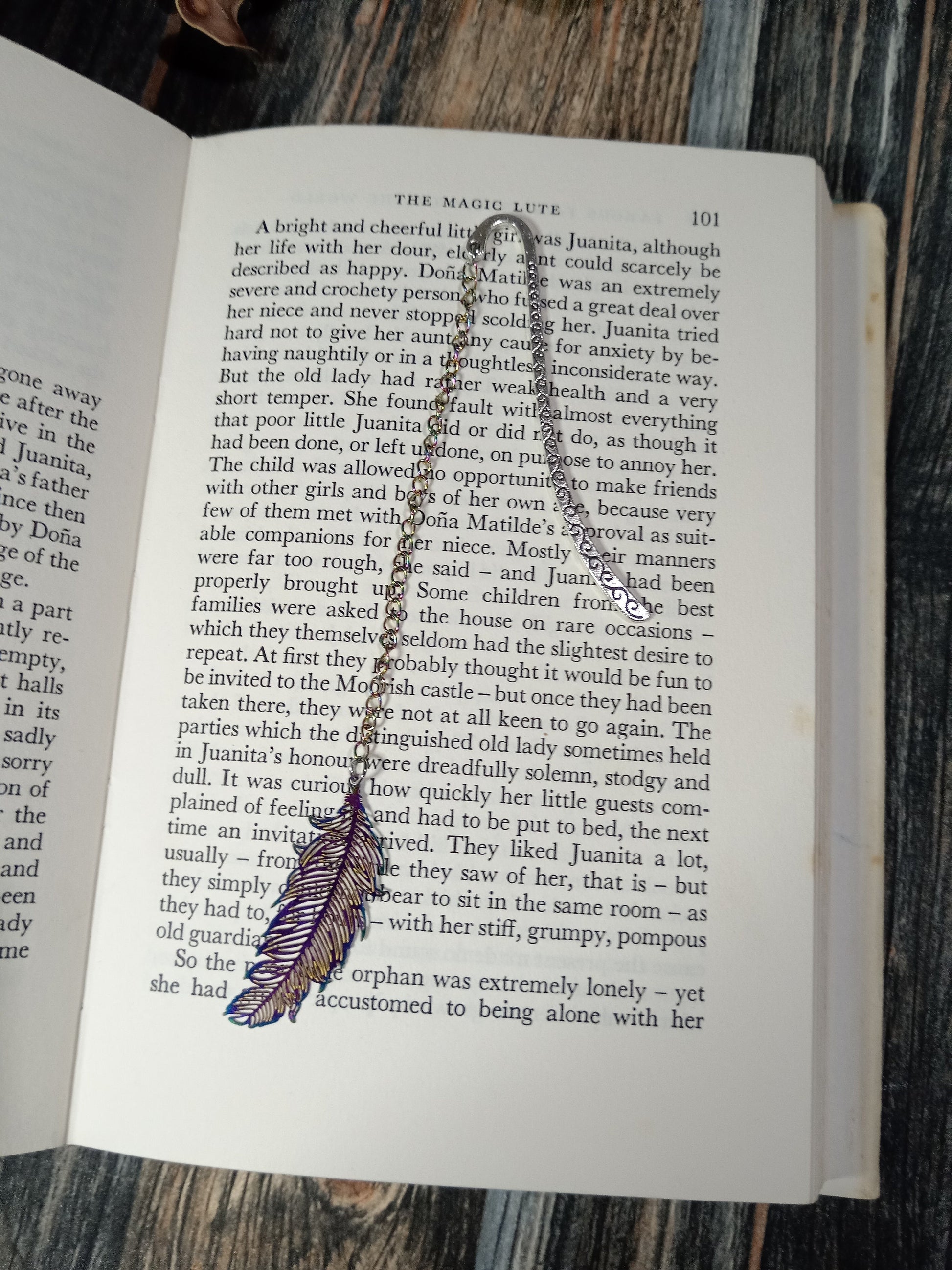Add your mark with these stylish metal bookmark hooks with cute charms. Hanging on an iridescent rainbow chain hangs a gorgeous feather charm.