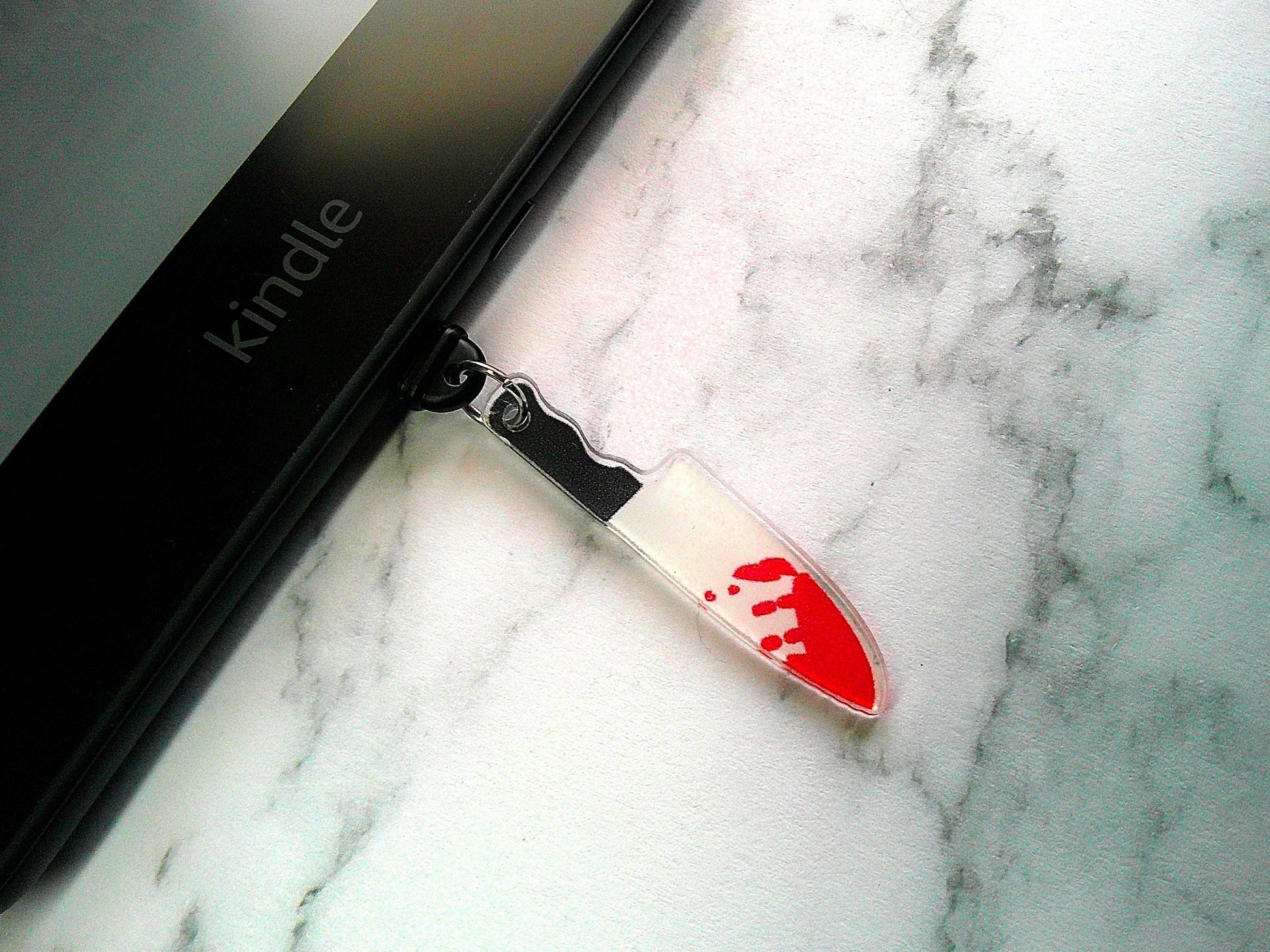 Keep your kindles charging port clean with these bloody weapon and hand charms!